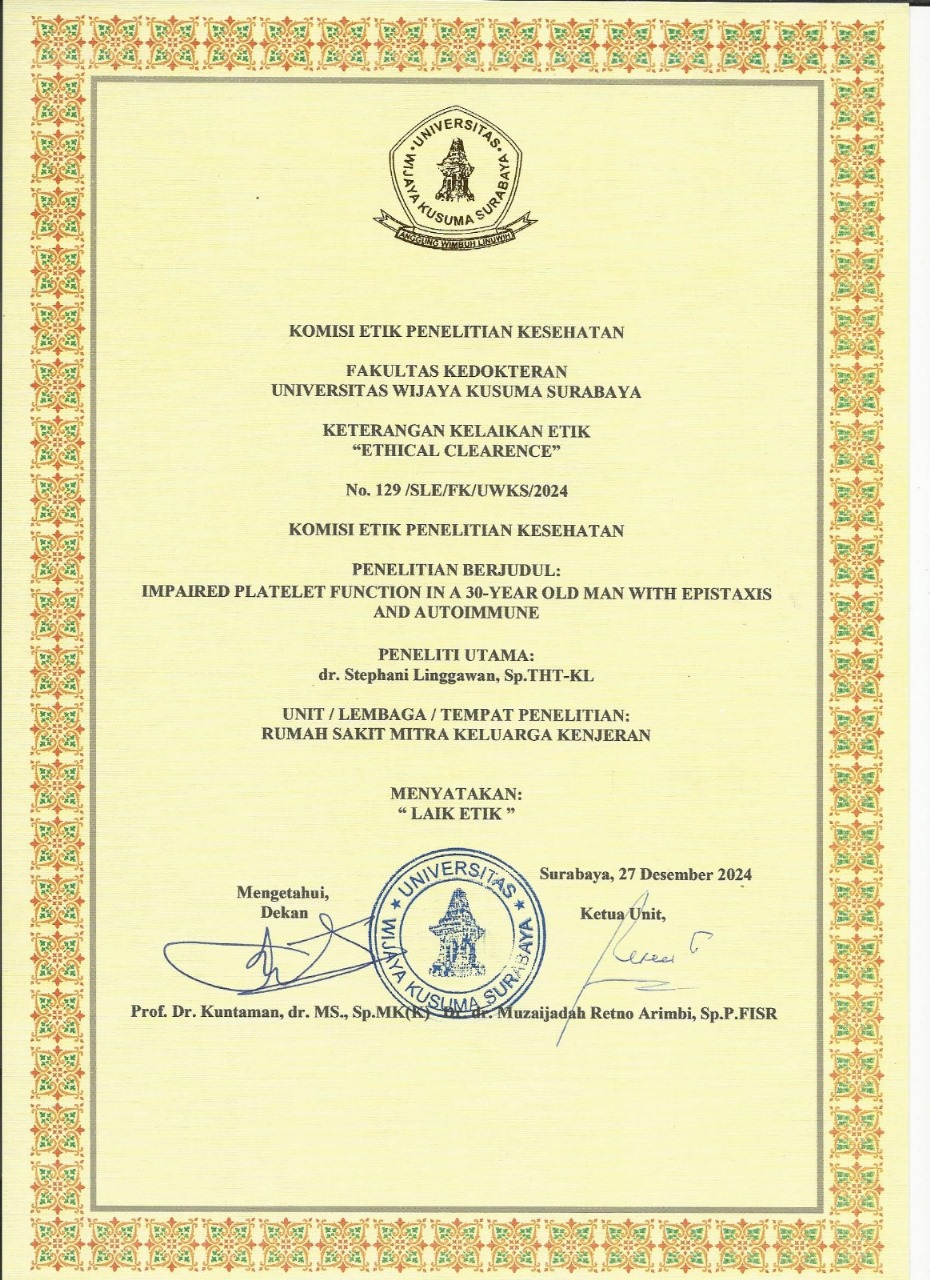 Background: Primary Sjögren syndrome is chronic systemic autoimmune disorder characterized by lymphocytic infiltration of the exocrine glands, most commonly presenting with dryness of the mouth and eyes. This case is very rare, which the antibody in the Sjogren's syndrome case concerns platelets. Objective: This case report emphasizes the occurrence of epistaxis in Sjögren Syndrome. Case Presentation: This case describes a 30-year-old male presenting with recurrent epistaxis as the initial clinical manifestation. Further clinical evaluation revealed hypertensive crisis and dryness in the mouth and nasal mucosa. The clinical presentation raised suspicion of an underlying autoimmune condition, prompting further testing, which confirmed the presence of anti -Sjögren’s syndrome type B (SSB) antibodies on an antinuclear antibody (ANA) profile. Result: The criteria for Sjogren's syndrome are based on the criteria if eye and mouth symptoms, eye and mouth clinical signs, and one of autoantibodies are found Anti-Ro (SSA), Anti-La (SSB), Antinuclear antibodies (ANA), Rheumatoid factor (RF). From this case has found symptoms of mouth and antibodies SSB. Conclusion: This case highlights that epistaxis can be caused by autoimmune cases, for epistaxis it is better to do screening for autoimmune examination test, emphasizing the need for further research to elucidate the diverse clinical manifestation, progression and prognosis factor.