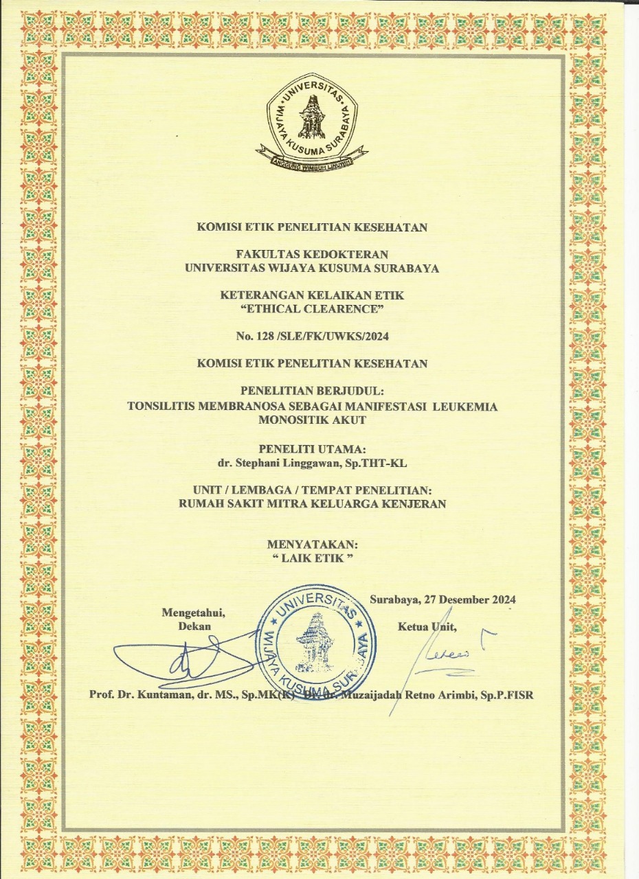 Background: Acute myeloid leukemia (AML) is a heterogeneous hematologic malignancy characterized by the clonal proliferation of immature myeloid precursor cells in the bone marrow and peripheral circulation. Hematologic manifestations such as anemia, thrombocytopenia, and leukocytosis are welldocumented, its association with oral involvement, particularly tonsillitis, is a rare presenting feature. Objective: This case report emphasizes membranous tonsilitis as the primary presenting feature in acute monocytic leukemia (AML-M5). The aim of writing this case study is to provide an illustration that the causes of membranous tonsillitis, beside from the infection, can also be caused by infiltration of leukemia cells. Case Presentation: We report a case of a 27-year-old female presented with fever and was found to have a fluctuating mass on the right side of the neck along with gingival swelling and hyperemic, hypertrophic tonsils with a membranous exudate. The diagnosis from bone marrow aspiration and immunophenotyping revealed as acute monocytic leukemia (AML-M5). Bacterial and fungal infections were excluded through gram staining, potassium hydroxide (KOH) examination, and throat swab culture. The patient was initially stabilized with hydroxyurea, with subsequent clinical improvement, before being referred to a tertiary center for definitive management. Result: This diagnostic workup altogether from all the clinicians leads to the diagnosis of acute myeloid leukemia (AML-M5). Conclusion: This case highlights primary tonsilitis as the primary presenting feature of acute myeloid leukemia (AML-M5), emphasizing the need for continued monitoring and regular follow-up assessment to detect potential relapses and ensure optimal disease managementReferences